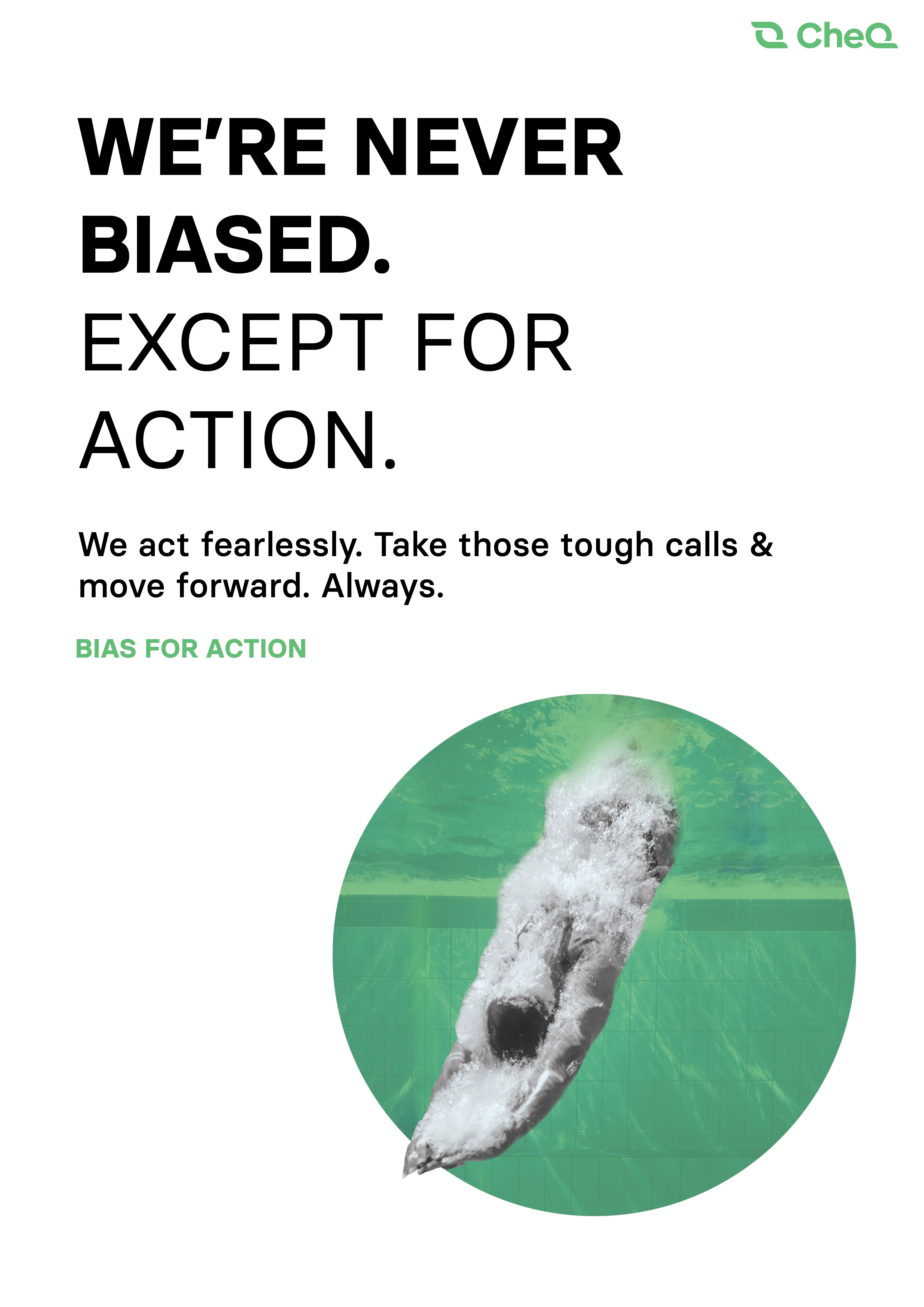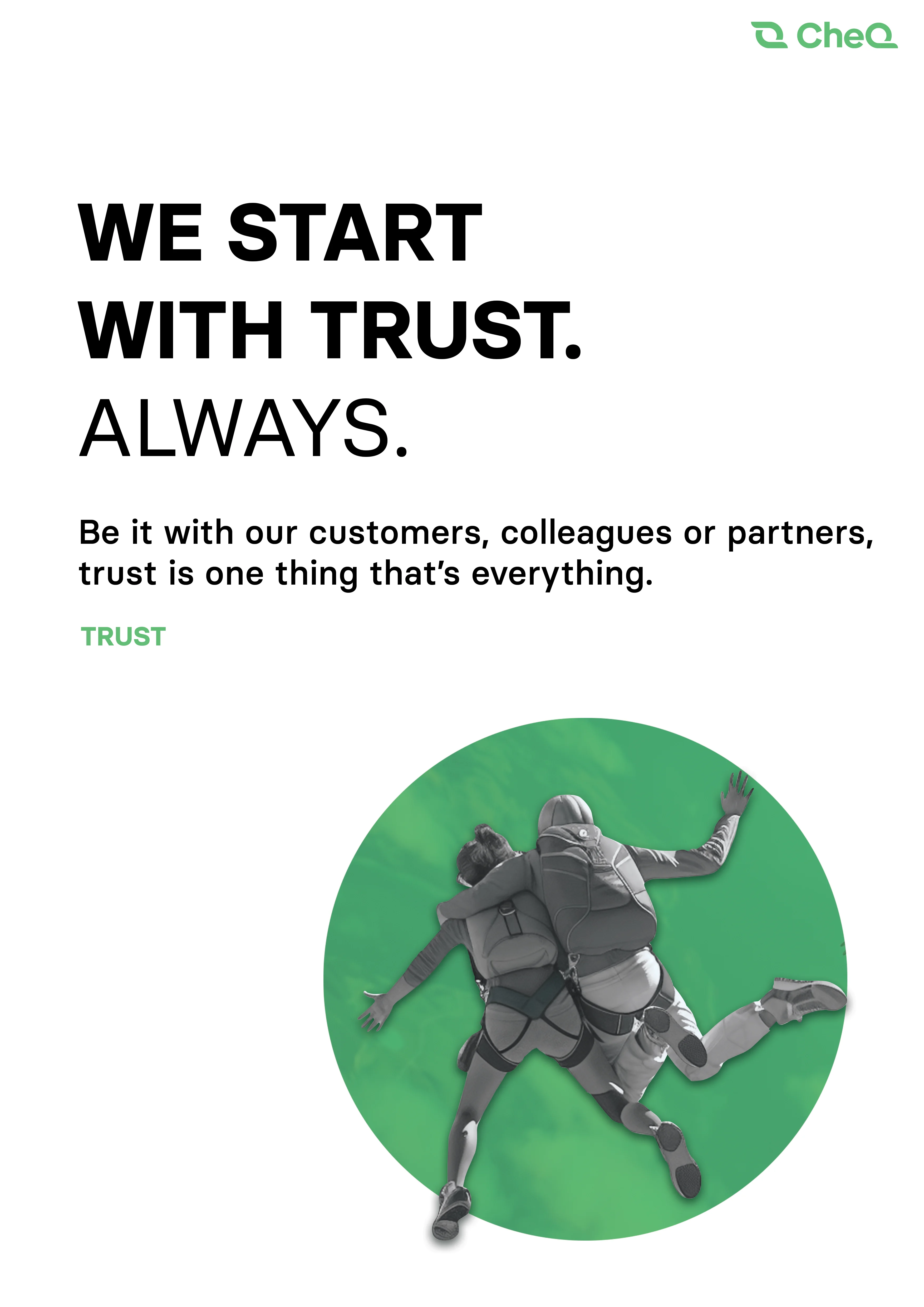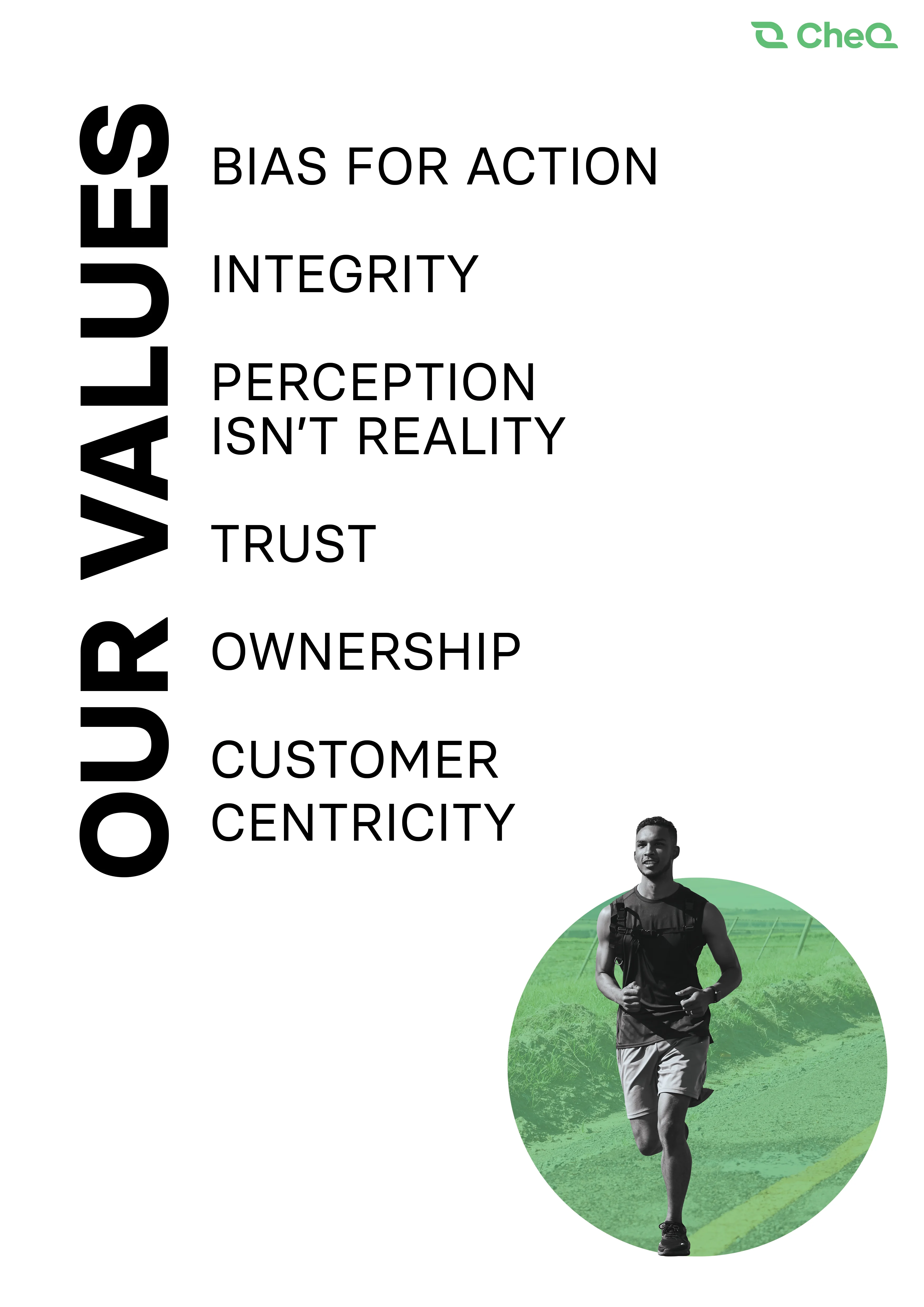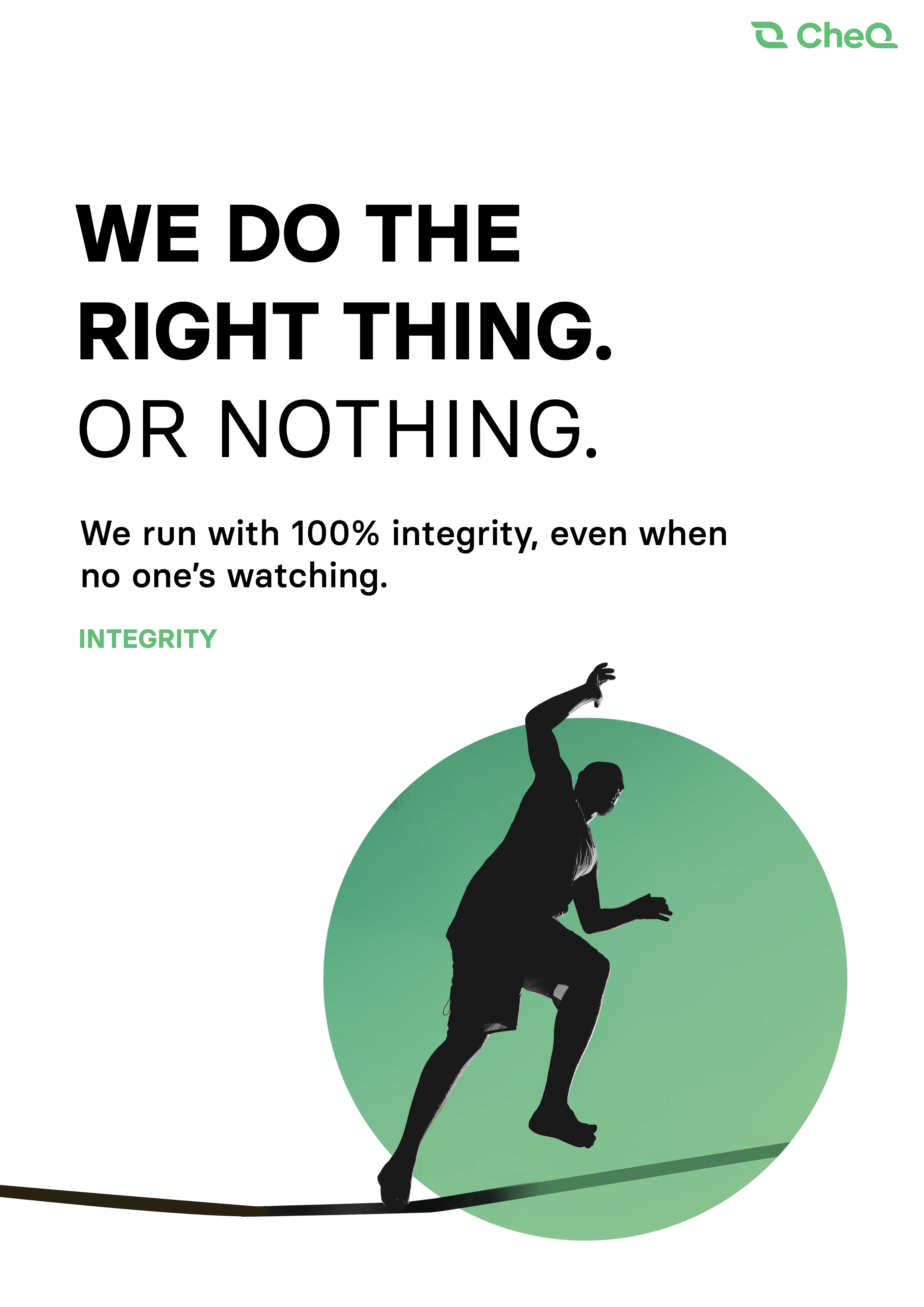 Our values are the principles that guide how we think, act, and build at CheQ. They shape our decisions, define our relationships and remind us of the kind of organisation we aspire to be every day.